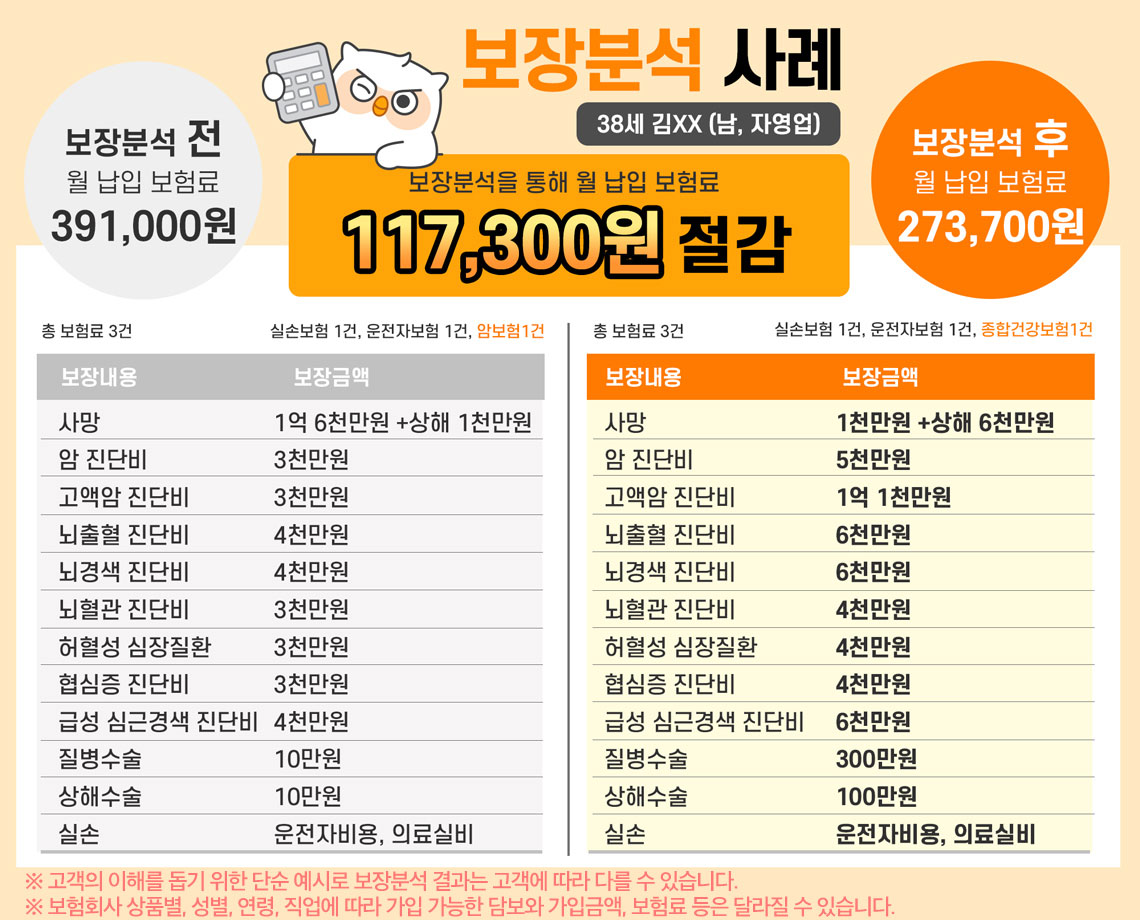 따라서 전문가에게 도움을 요청해서 보험 상품 및 보험료 비교를 반드시 해야 하며, 이 과정에서 불필요한 상품과 중복되는 상품 등을 걸러낼 수 있고, 부족한 부분은 보완하거나 새로운 상품도 고려해볼 수 있다.